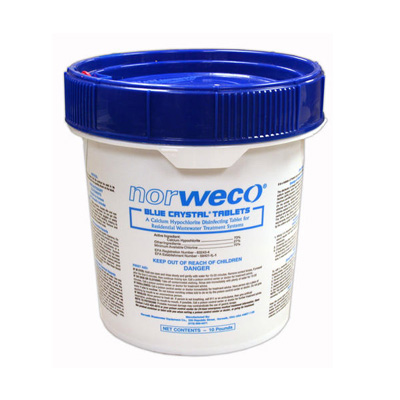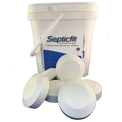 Most disinfection devices on systems manufactured in Texas use tablet chlorination. The photo below shows the typical tablet chlorinator setup. In the last tank, there will be a white, 4” PVC pipe with a translucent blue tube. This is the chlorinator. Pull it out and add 3-4 chlorine tablets and check it monthly.
